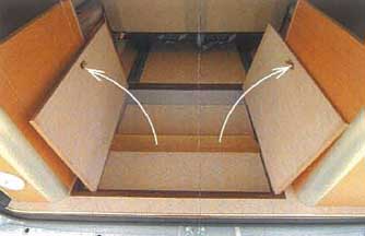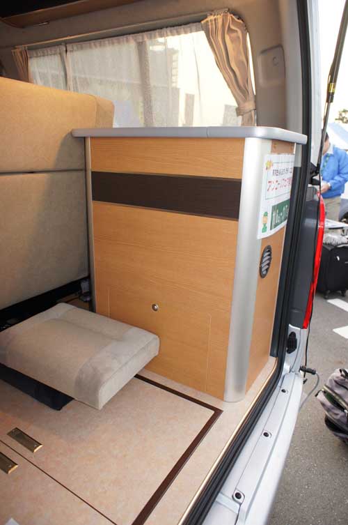 後部中央の床は掘り下げ式になっており、キャンピングカーの仕様要求であるギャレー前の高さを確保することにより、キャンピングカー登録に対応している。使わないときはスペアタイヤと小物入れとして使用できる。