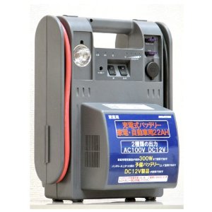 家庭用AC100V機器が屋外で使用できるポータブル電源。300Wまでの機器が使用できる。容量は22Ahで、例えば100Wの29インチ液晶テレビでも、2時間程度使用可能。サーチライト付き。