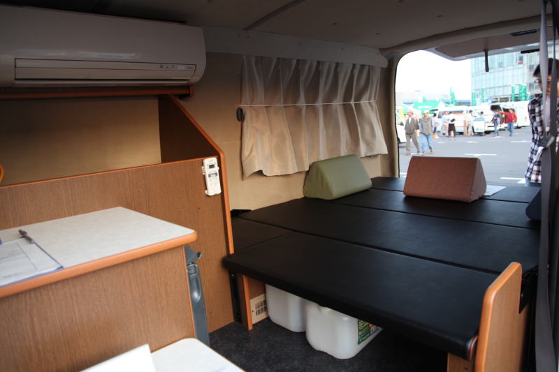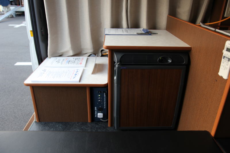 利になる。ただし、当然就寝スペースは削られることになる。冷蔵庫もオプションで装備することができる。冷蔵庫はキャビネット付きで搭載されるため、キャビネットの上部をテーブルとして使用することができる。また、電子レンジもオプションで装着可能である。ただし、バッテリーで電子レンジを動かすと一気に蓄電量が減ってしまうため、外部電源の使用が前提となる。