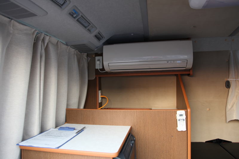 わけではない。家庭用エアコンを搭載する場合、室外機の設置場所に悩むことになる。スーパーエースでは、架装ルーフ後部にくぼみを持たせ、そこに室外機を設置していたが、一見して家庭用エアコンの室外機と分かるので、気になる人にはちょっと違和感があったかもしれない。しろくまくんでは、家庭用エアコンの室外機は室内に設置されているため、外部から見えることはない。