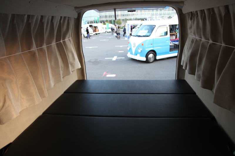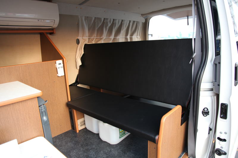 要件を満たしていないので4ナンバー(貨物車)登録となる。このため、後部は荷物を積むことができるようになっていなければならず、エアコン室内機は後部には設置できない。よって、エントランス向いのこの位置に設置されているわけであるが、室内機もすぐ上にあり、特に不都合があるわけではない。後部は2列目シートが進行方向向きに設置されており、2名着座することができる。