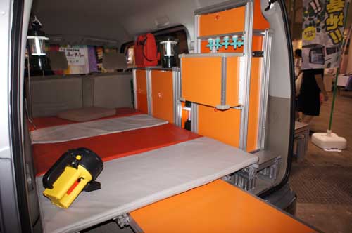 これはキャンピングカーではなく、車中泊キットと呼ばれるもの。独自の骨組みとパネルで簡単にベッドや収納を作ることができる。例えば、日常はノーマル仕様のクルマとして使用するが、休日にはこのキットで簡単にベッドや収納庫を設置してキャンピングカー仕様にしてしまうことができる。常設ではないので今乗っているクルマもキャンピングカー仕様にできる。