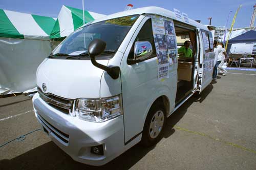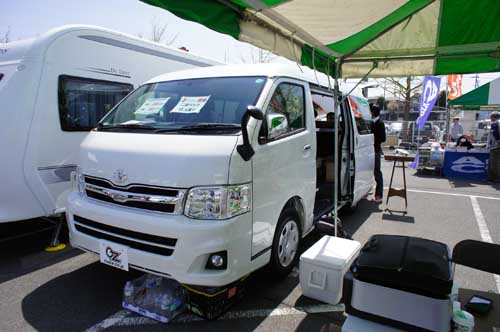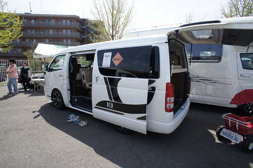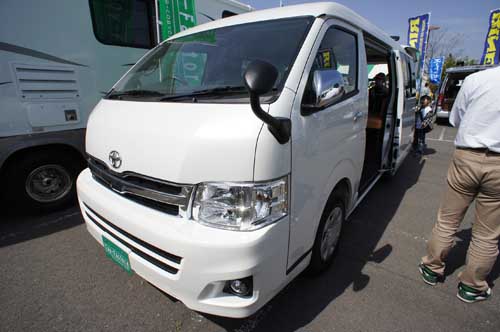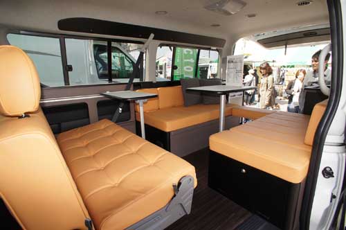 ハイエースワイドボディーミドルルーフをベース車に選択。2月の幕張ショーでは参考出品だったが、今回は正式なモデルとして展示。鮮やかな配色のレザー調シートが特長で、中央にダイネット、後部にギャレーと冷蔵庫が付く。