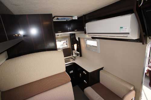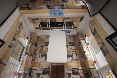 ハイエースベースのキャブコンQ7、ハイエースSLベースのQ3に次ぐ第3弾が、ハイエースワイドボディーミドルルーフをベースにしたこのQ1。先行の2車種と同様、質感の高いインテリアと右、後部のアクリル2重窓が特長。