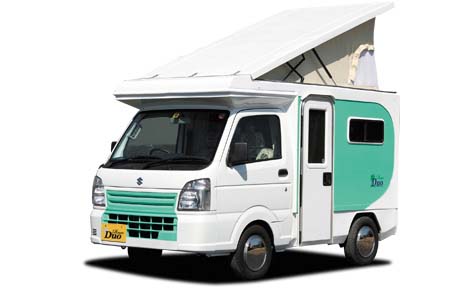 今回神奈川キャンピングカーフェアには初参加という同社からは、バリ島をイメージしたというインテリアの軽キャンピングカー「リゾート・デュオ」を出展。その名の通りカップル仕様となっており、家具は南国のマホガニーを使用。シート地も南国調のもの。今までにないコンセプトの1台。