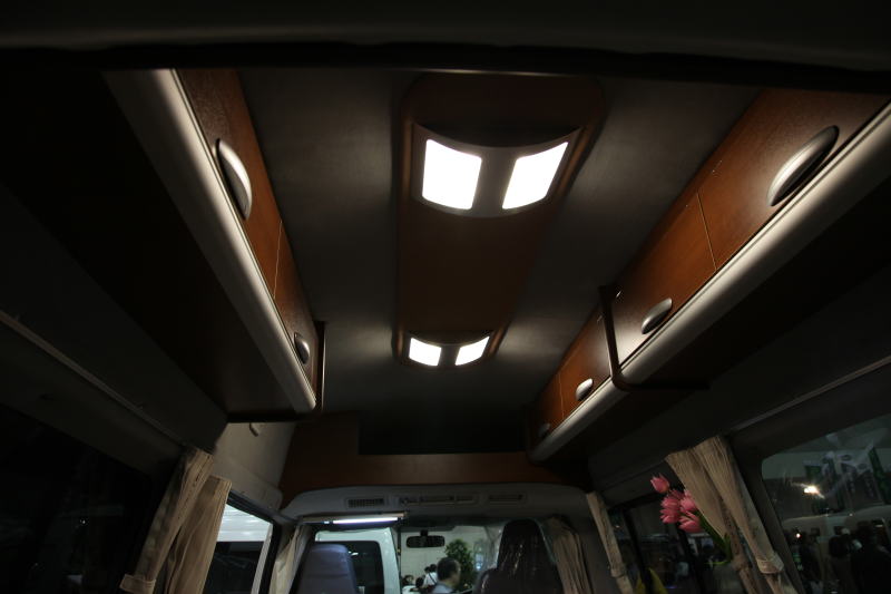 架装ルーフで天井が高くなっている恩恵を最大に利用して、オーバーヘッドコンソールや収納庫は充実したものになっている。ダイネット上部には左右ともに収納庫が設けれれている。また、運転席上部も収納庫になっており、シュラフなどの置き場所として最適だろう。ダークブラウンをベースカラーにしたシックなコーディネートとなっており、ダイネットのライトブラウンとうまく調和している。