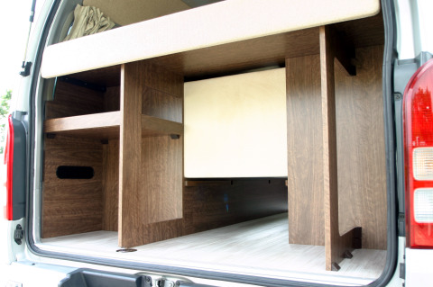 外見は、ハイエース標準ボディーハイルーフそのままであるが、良く見ると右側後部の窓は埋め込まれ、エクステンションボックスが架装されている。外見上、ノーマル車との違いはここだけで、ぱっと見ただけでは、キャンピングカーと分からないかもしれない。しかし、このエクステンションボックスのおかげで、室内は標準ボディー車ながら広さを感じることができる。