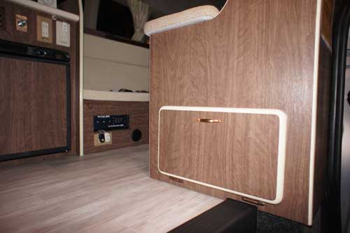 ギャレーユニットは車内左側に設置されている。それぞれ蓋をすると、卓上が面一になりテーブルとして使用できる。冷蔵庫はエンゲルの40リッター上開き。シンクの下には各10リッターの給排水タンクが収納されている。給排水タンクはエントランスのすぐ右側に置かれているので、車外から靴を履いたままで取り出したり収納したりすることができる。上段ベッドをフルスペースにした場合は、ギャレーの上部もベッドマットを敷くことになるが、ベッドマットが分割されているため、冷蔵庫の中のものを取り出すことはできる。