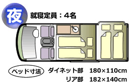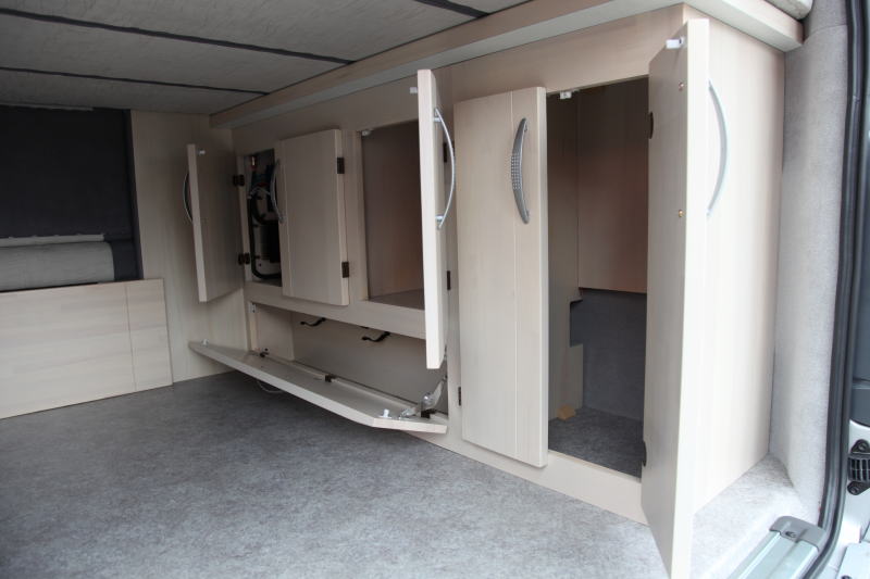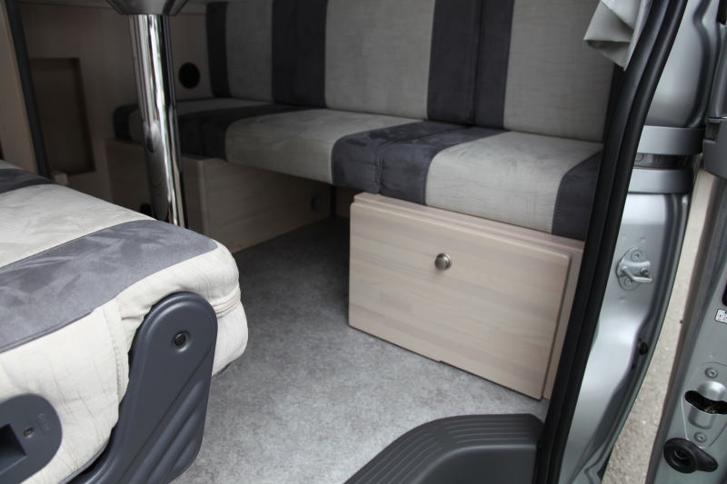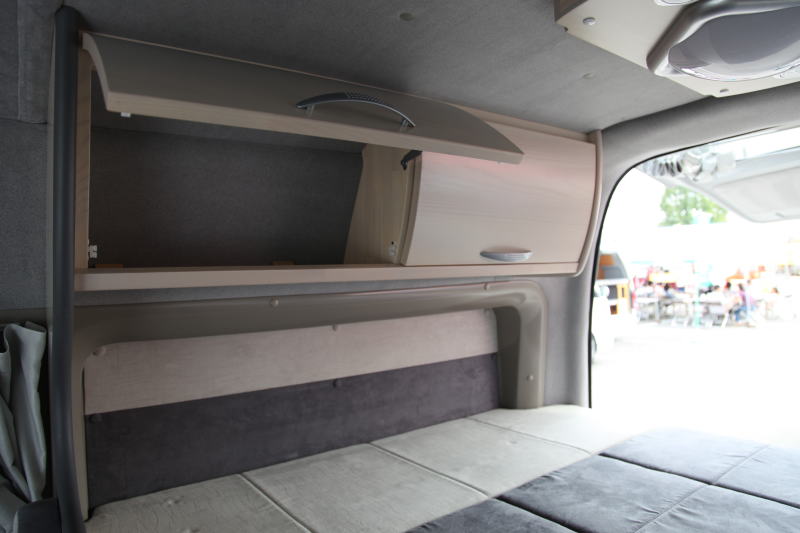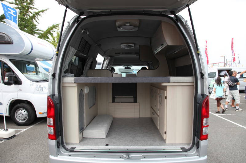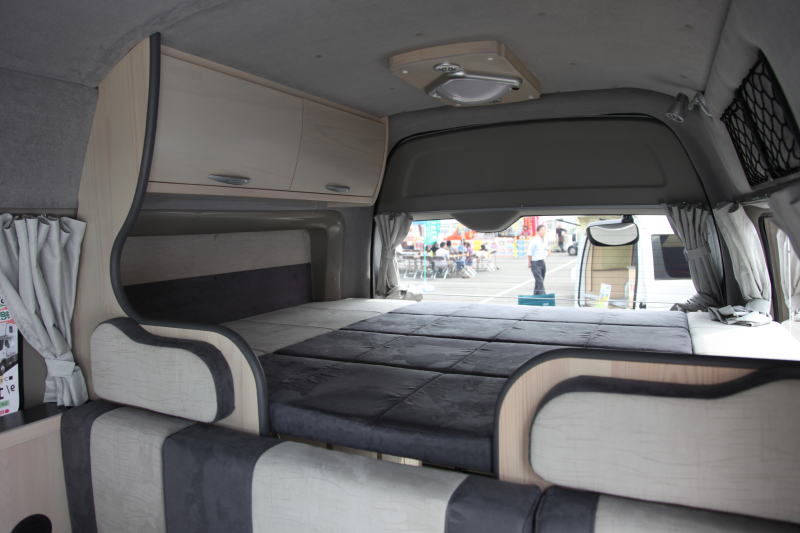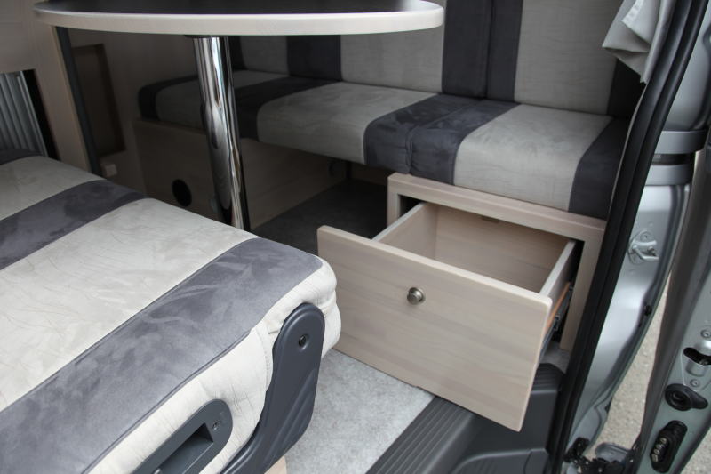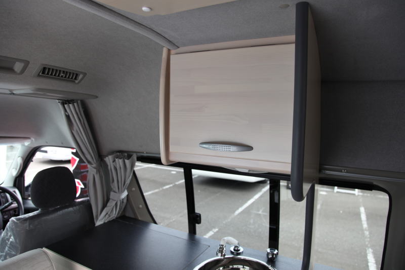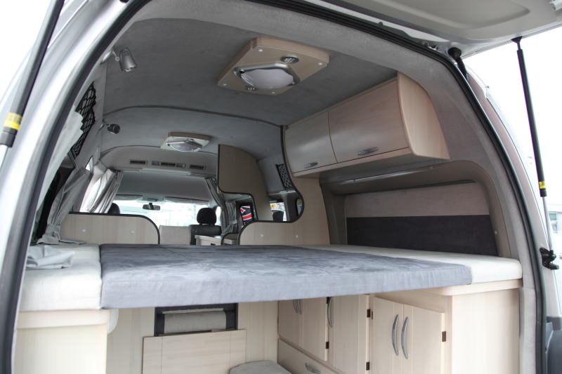 レイアウトは対面式ダイネットと後部のハイマウント常設ベッドからなり、シンプルな構成である。ギャレーはダイネットのすぐ横に配置されており、ダイネットからアクセスしやすい反面、ギャレー前は2列目シートがいっぱいに来ているため、調理する場合は窮屈かもしれない。ハイマウントベッドの下は広大な収納庫になっており、後部両側には収納キャビネットも装備される。