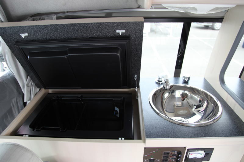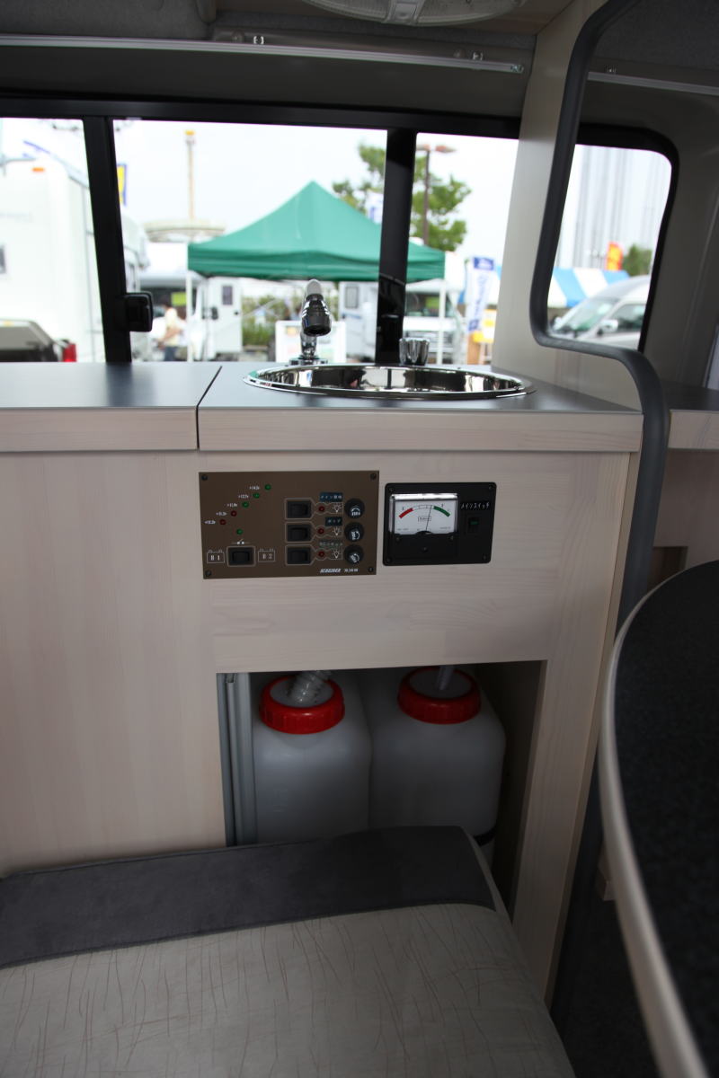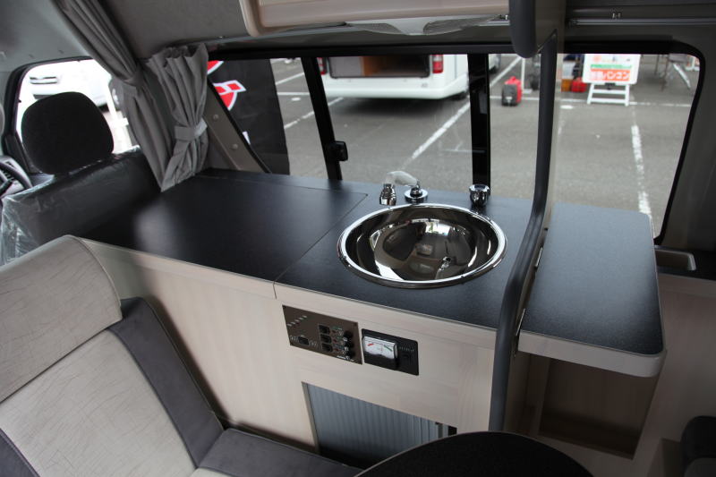 ギャレーは一般的な大きさのもので、丸型シンクと冷蔵庫が並んでキャビネットに収納されている。2列目シートがギャレーのすぐ横まで来るため、ギャレーの前に立って調理することができないので、調理する姿勢は限られるが、調理時間が短い料理であれば、ダイネットから手を伸ばせば届く範囲のため、便利かもしれない。なお、シンクの下には給排水タンクが収納されているが、ダイネット状態にしていると2列目シートが邪魔になってタンクを出し入れするのが多少面倒。