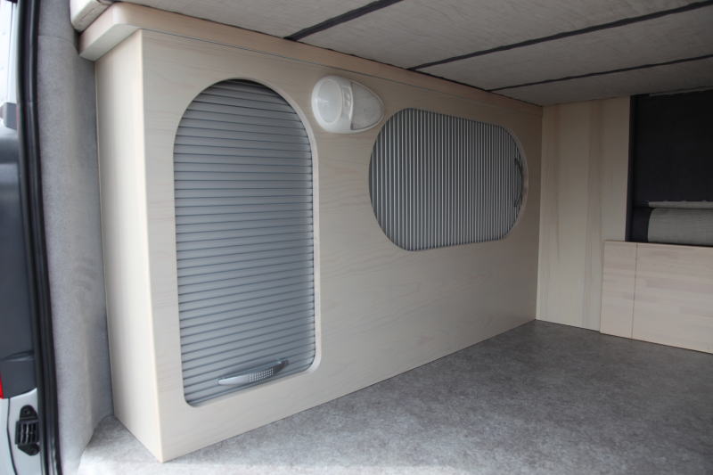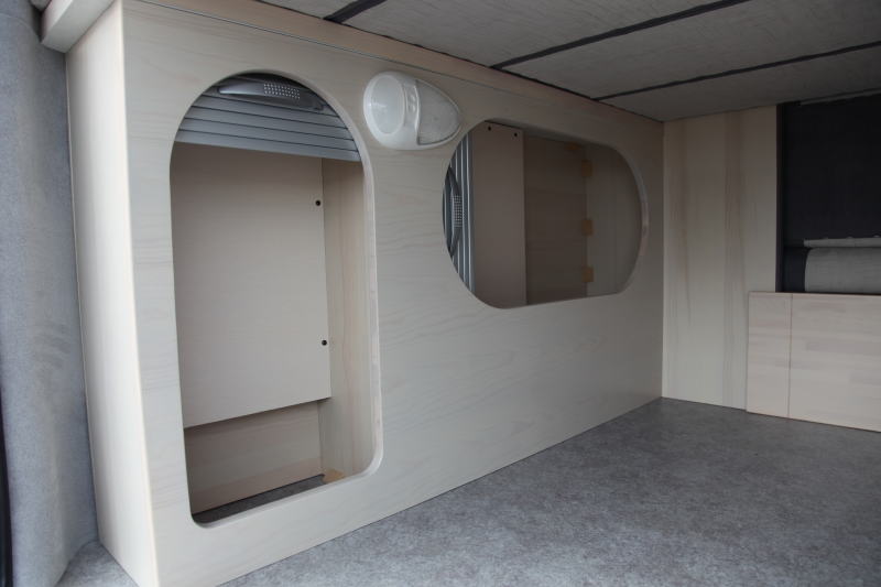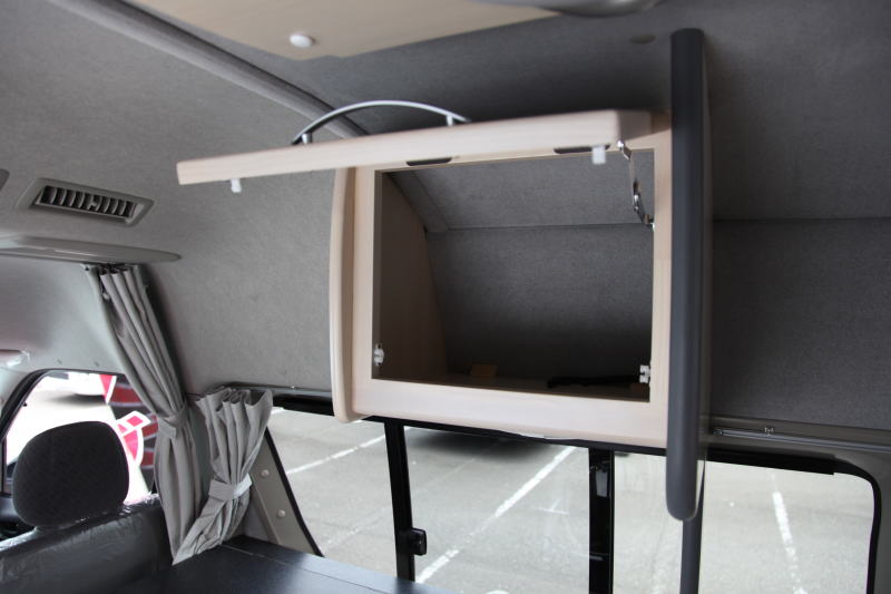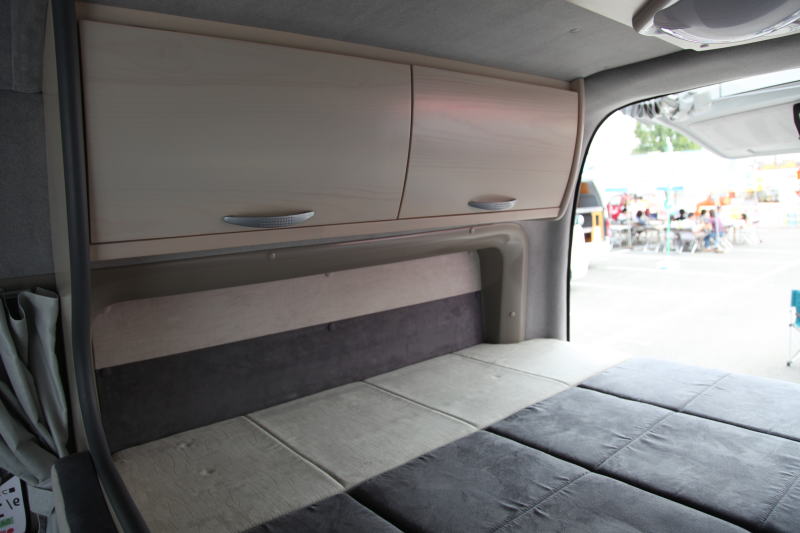 後部ハイマウントベッドは常設ベッドの位置づけとなる、右側後部の窓は、車幅方向の就寝で身長方向の長さを稼ぐため、張り出しとなっているが、このおかげで182mm