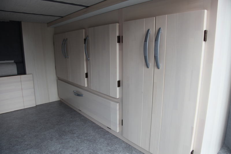 ハイマウントベッド下は大きな収納庫になっており、両サイドには収納キャビネットも用意されているので、収納力は抜群である。また、オーバーヘッド収納も充実しており、収納力に関してはかなり余裕がある。ハイマウントベッド下の収納庫はリアハッチを開けて荷物の出し入れをするのがやり易いが、室内からでも行き来することができる。収納庫いっぱいに荷物が積んである場合は難しいが、荷物が少ない場合は、ダイネットから隙間を通ってベッド下収納庫に入ることができる。両側の収納キャビネットだけでもかなりの容量がある。オーバーヘッド収納庫はベッド上部、「スタイルウインドウ」の上部に2連の収納庫が、そしてダイネット上部に小型のものが一個装備されている。どちらも奥行きは十分深く、オーバーヘッド収納といっても立派に収納力がある。また、これらの収納庫のほかに、ダイネットソファー下のスペースを利用した引き出しもある。